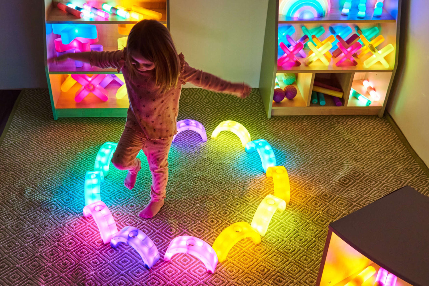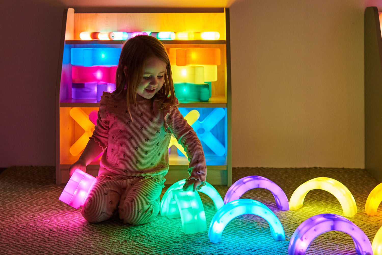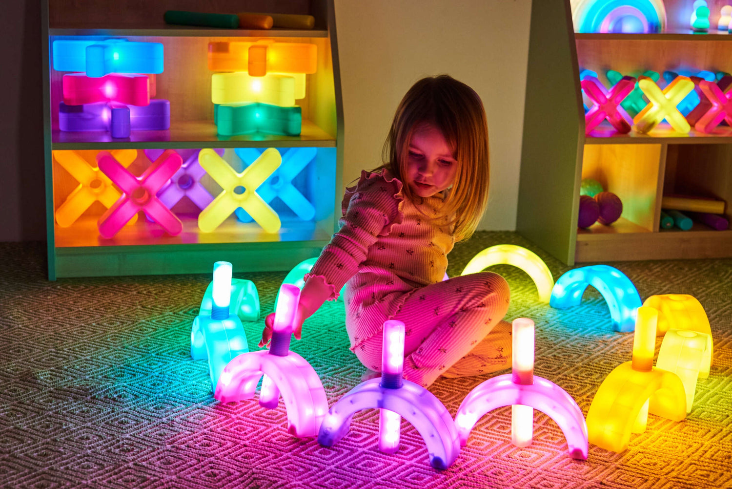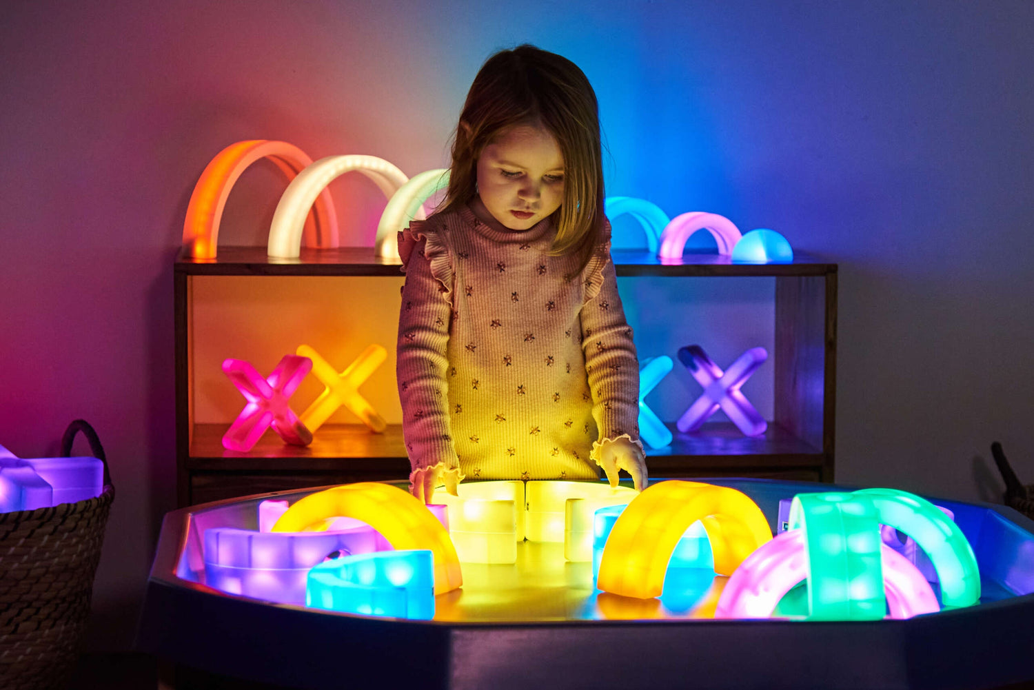 Avadega gaismas stieņi padara būvniecības spēli vizuālu un atbalsta agrīnās matemātikas prasmes.