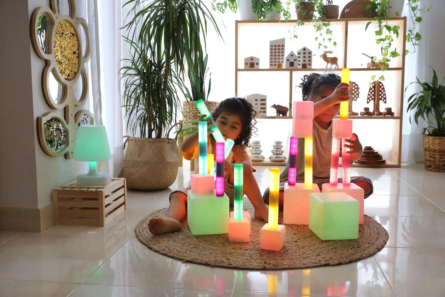 TTS Spīdošo cilindru komplekts, 12 gab., ir uzlādējami gaismas cilindri sensorai un konstrukciju spēlei. Pieskaries cilindram, un gaisma iedegsies uz trīs minūtēm. Bērns var rullēt, stumt un būvēt ar cilindriem, lai apgūtu cēloņu un seku sakarības. Piemērots no 10 mēnešu vecuma.