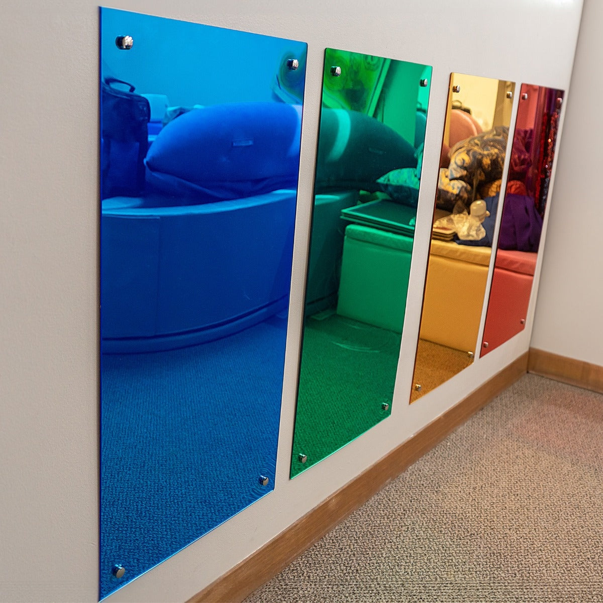 "TTS vikerkaare seinapeeglid sobivad peeglimängu ja valguse avastamise toetamiseks lasteaias ja alushariduses. Suur peeglipind aitab beebil ja väikelapsel märgata oma liikumist ning toetab suhtlust, kui laps osutab, matkib ja kirjeldab nähtut. Vanemad lapsed saavad peeglit kasutada näoilmete harjutamiseks, rollimänguks ja kehateadlikkuse tegevusteks. Peegel on valmistatud vastupidavast akrüülist, mis sobib turvalisemaks kasutuseks varases eas. Seda saab paigaldada seinale nii kõrgele kui madalale ning kasutada püstiselt või horisontaalselt.