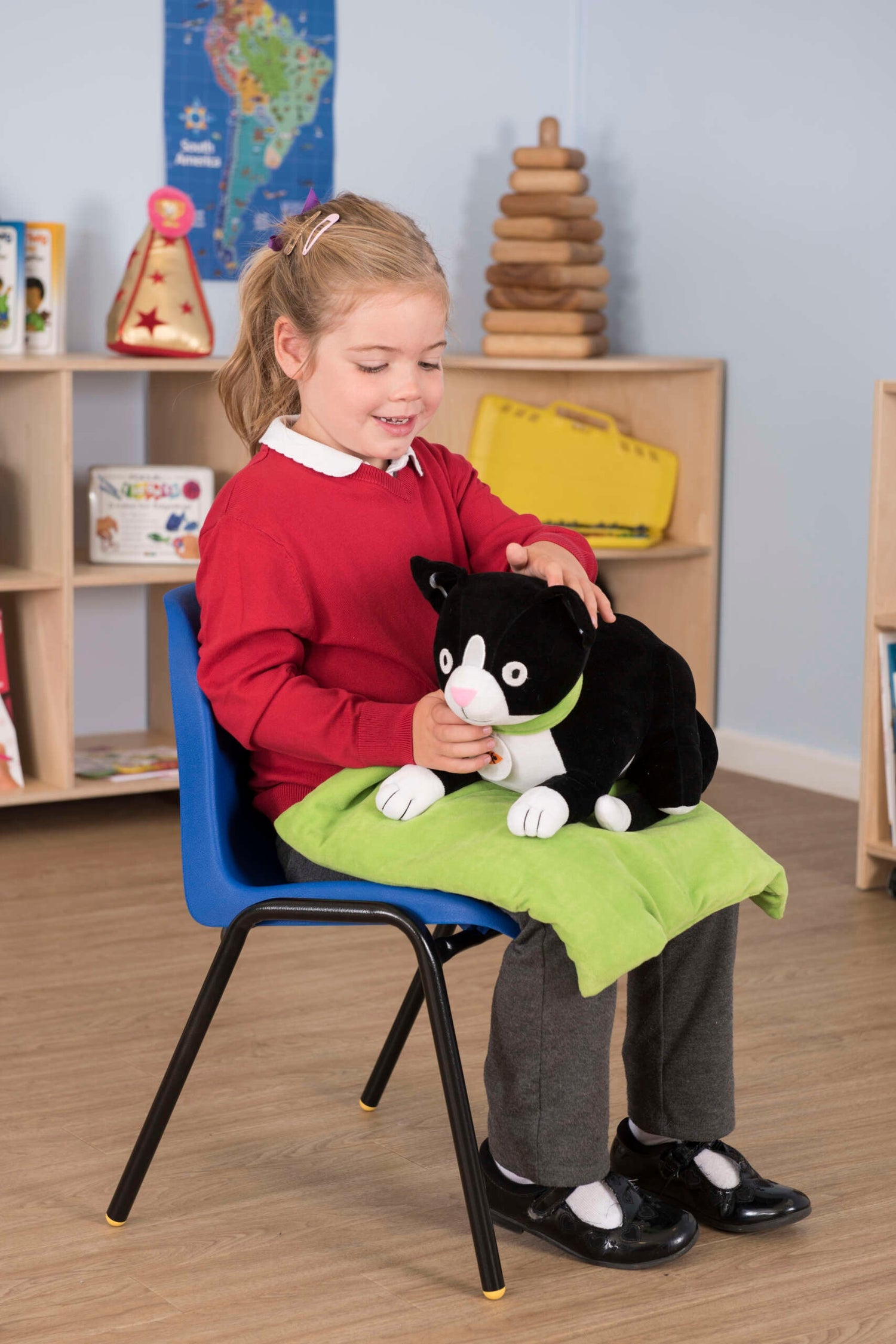 "TTS 1,36kg kaaluv kassikujuline raskusloom koos väikese 907g raskustekiga on loodud andma ühtlast sügavat survet koolipäeva jooksul. Kasuta raskuslooma ja tekki, et vähendada nihelemist ning toetada keskendumist rühmategevustes, iseseisvas töös ja rahunemisalas. Pehme veluurpind ja PVC graanulitega täidis teevad komplekti vastupidavaks igapäevaseks kasutuseks. Puhasta pühkides niiske või antibakteriaalse lapiga. Loom ja tekk on eraldi, seega saad survet lihtsasti kohandada lapse vajaduse järgi.