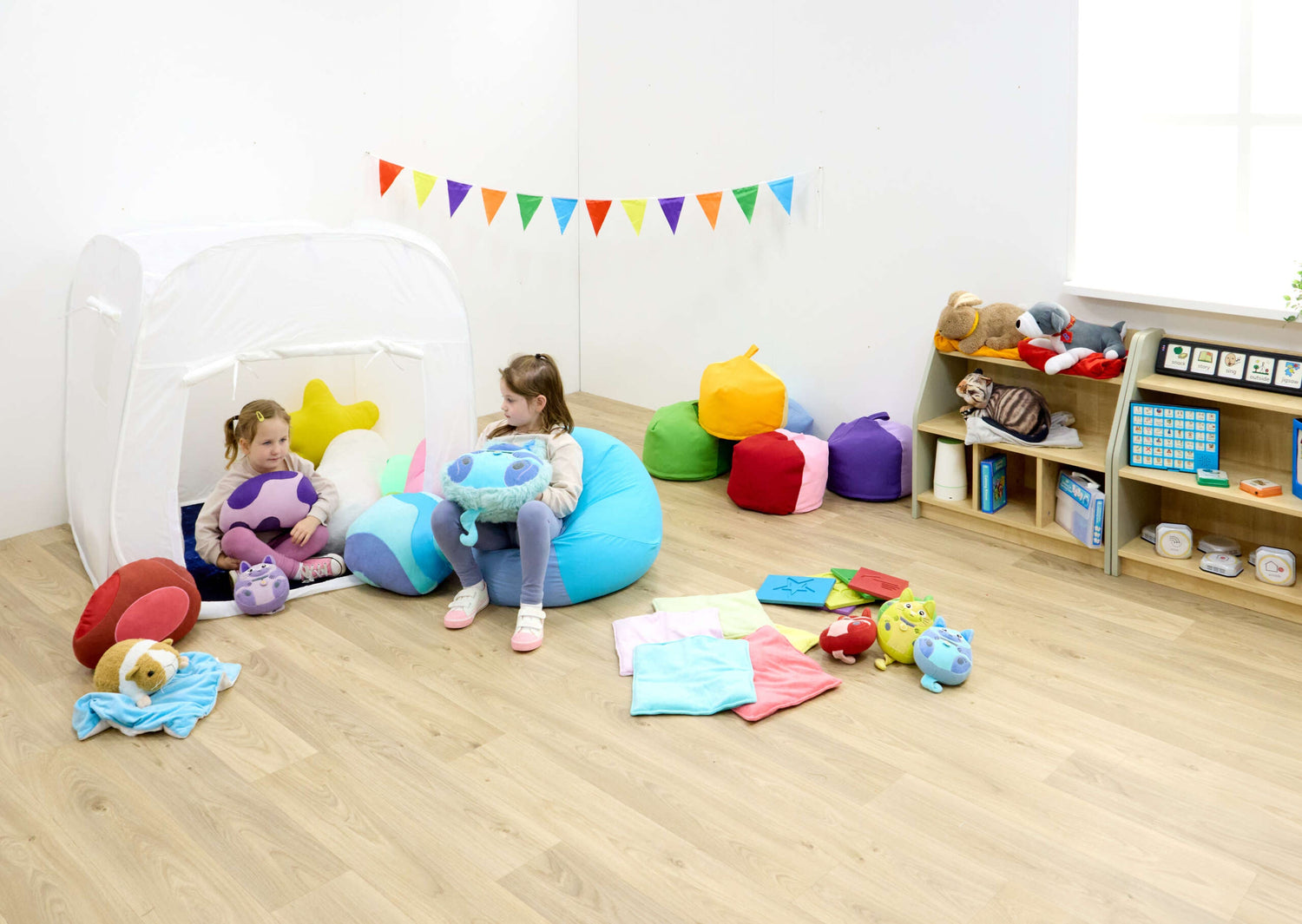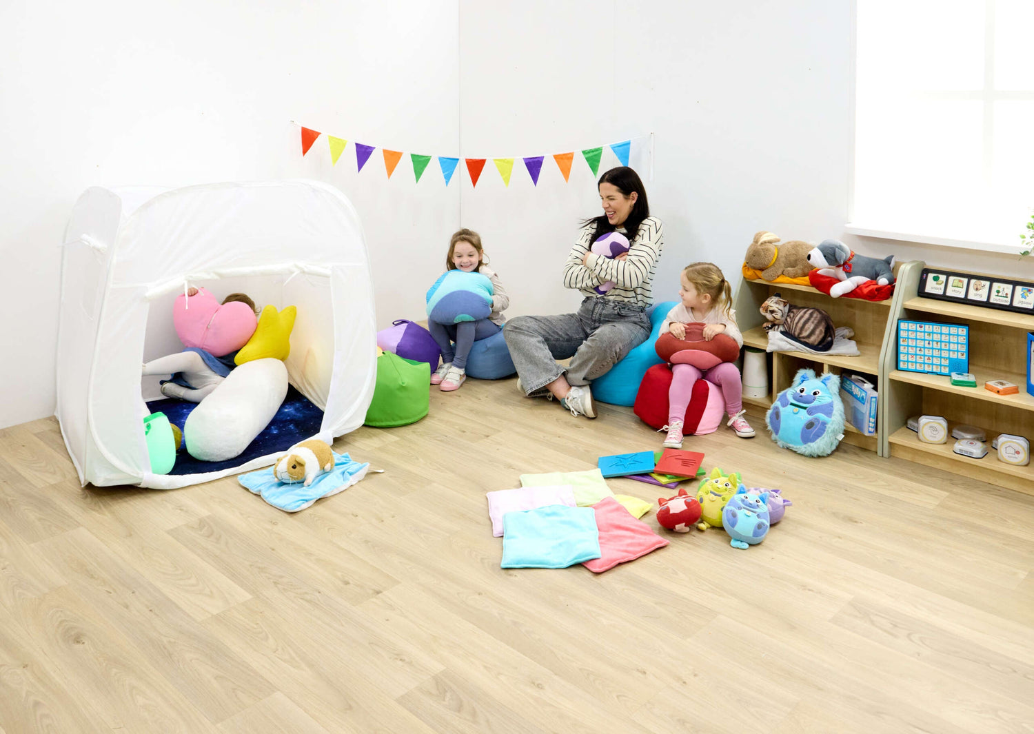 Kolm erineva tekstuuriga patja annavad lihtsa rahustava surve, mida laps saab ise valida ja kasutada.