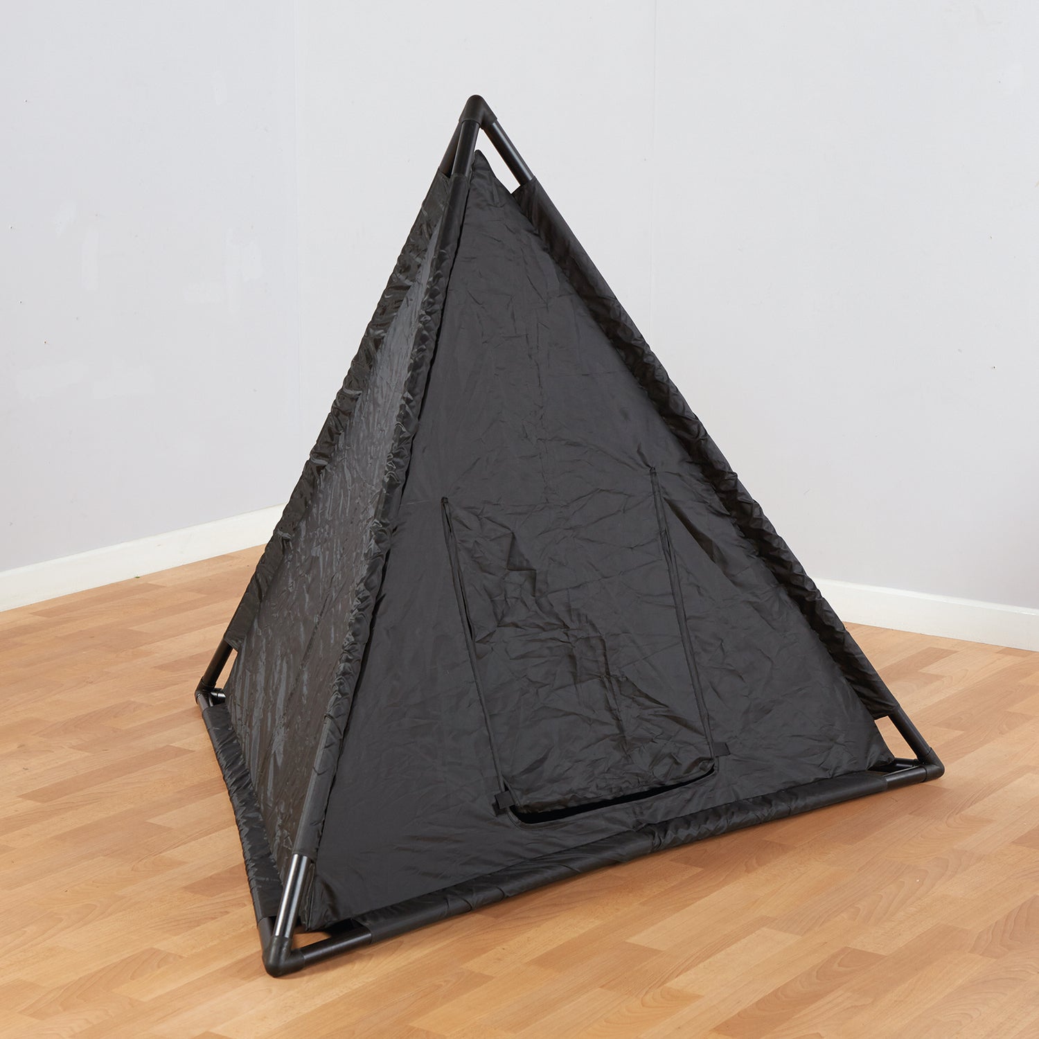 Piemērots maņu attīstīšanai, kabatas lukturu izmantošanai, spēlēšanai ar tumsā mirdzošām rotaļlietām un bērnu mājīgai patvērumam. Dekorējiet trīsstūrveida aptumšošanas mājiņas ārpusi ar audumiem un izveidojiet no tā tipi teltīti. Jāsaliek pašam. Melns. Izgatavots no neilona. K 150 x L 150 cm.