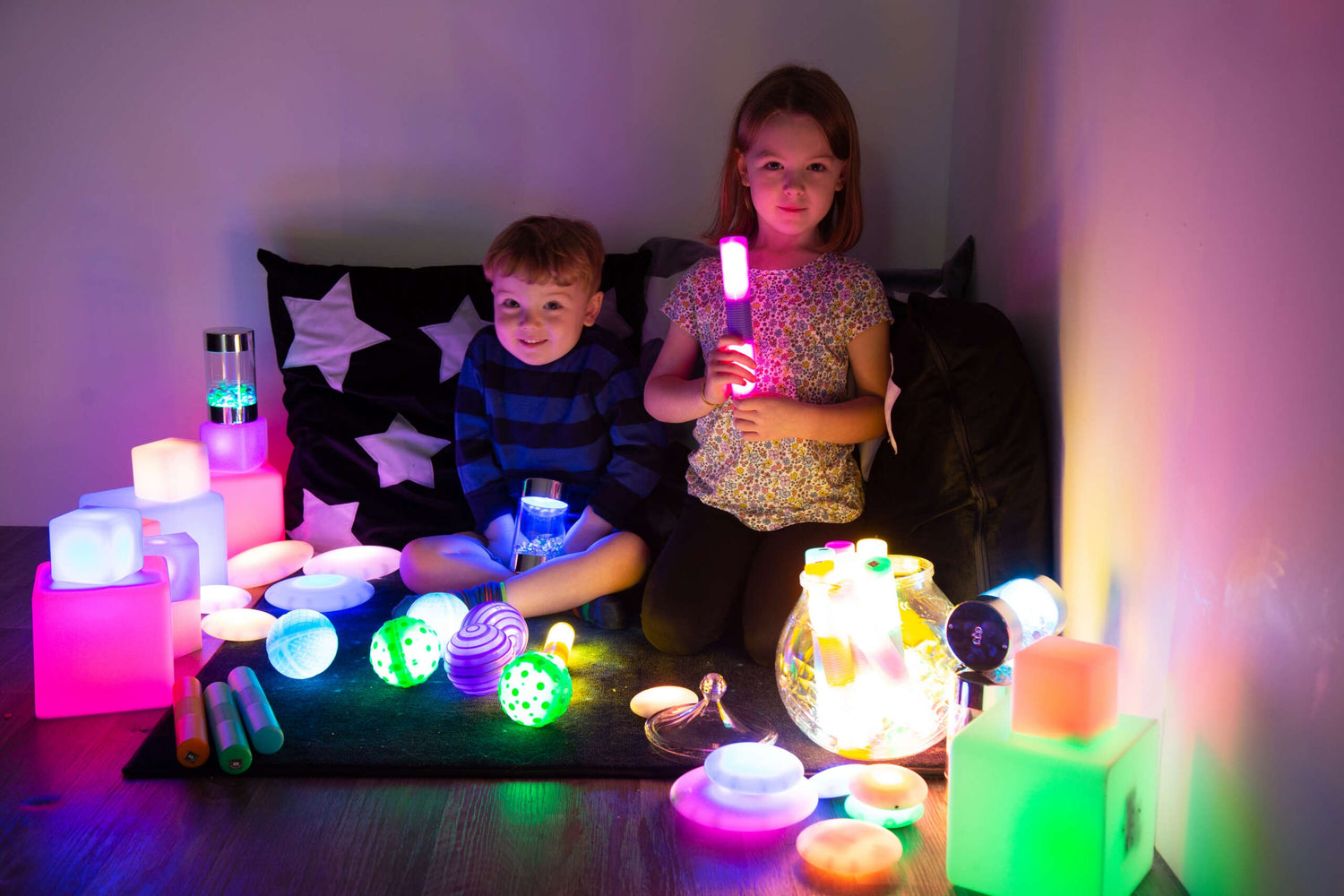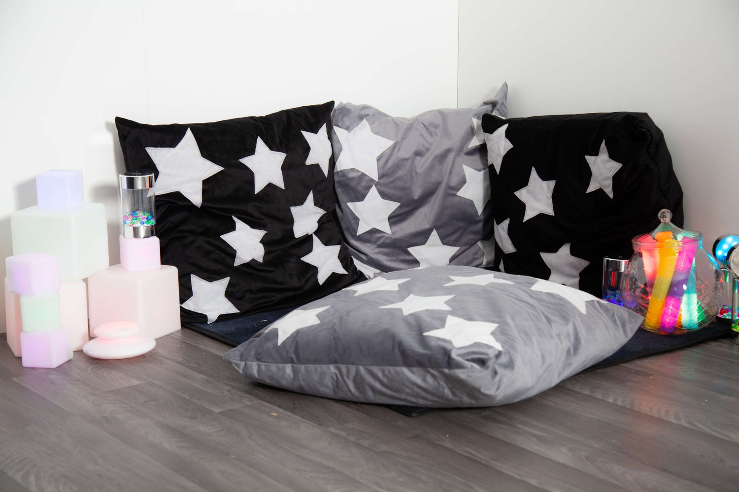 TTS tumšās gaismas spilventiņi, 2 gab. – pelēki, ir divpusēji mīksti grīdas spilventiņi sajūtu telpai, mierināšanas zonai un lasīšanas stūrītim. Uzlādējot gaismā, zvaigžņu puse tumsā spīd un nodrošina maigu vizuālu fokusu. Otrā puse ir vienkrāsaina, ja skolēnam nepieciešams mazāk stimulu. Spilventiņi ir pildīti ar augstas blīvuma putām, kas sniedz atbalstu sēžot un atpūšoties. Noņemamais pārvalks ir mazgājams 30 grādu temperatūrā.
